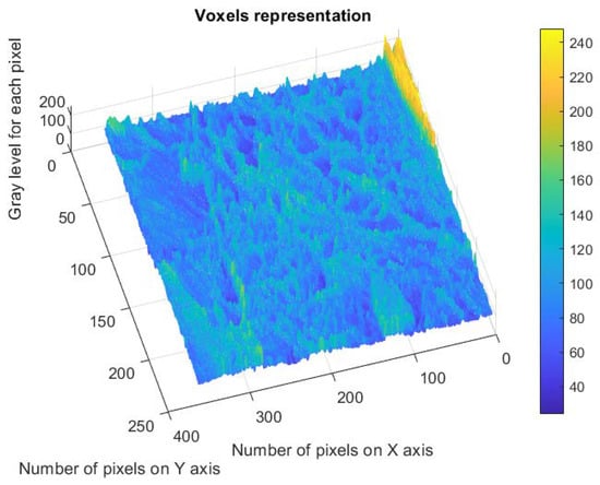 Figure 15 shows the estimated voxels of the 6X-Hg image, a 3D illustrative portrait of the voxels with the gray level values on the Oz axis, with the position of an adequate number of pixels marked on the last two plain axes and individually on the Ox axis and the Oy axis [].