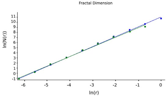The slope of these lines is equal to the fractal dimension of the studied geometric object, respective to the corresponding SEM image []. The values obtained for the fractal dimension are d1 = 1.71 for the green regression line and d2 = 1.74 for the blue regression line.