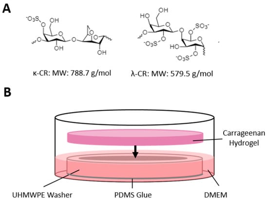 Schematic of Experimental Set-Up. (A) Chemical structures of λ-CR and κ-CR respectively. (B) Schematic of cellular confinement experiments, where the culture medium was confined radially by an UHMWPE washer and vertically by a CR hydrogel.