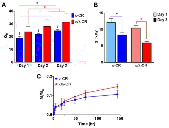 κ-CR and κ/λ-CR hydrogels (5% w/v) were formed as described above. Initial mass, M0, of each gel was measured with a Mettler Toledo XS104 Balance (Columbus, OH, USA). Hydrogels were then incubated in 24-well plates with PBS for 1–3 days at 37 °C. Hydrogels were removed from the PBS, gently patted with a Kimwipe to remove excess liquid, and swollen mass, Ms, was measured. Hydrogels were then dried for 24 h at 60 °C to obtain the dry mass, MD. Swelling ratio QM, was calculated as Ms/MD. Hydrogel mechanical properties were measured using an AR 2000ex Rheometer (TA Instruments, New Castle, DE, USA) with a 20 mm parallel plate geometry. Hydrogels were prepared, cut into 1 × 20 mm slabs, and incubated in PBS at 37 °C for 1, 2, or 3 days. Storage modulus, G′, and loss modulus, G″, were measured as a function of angular frequency from 1–10 rad/s.
