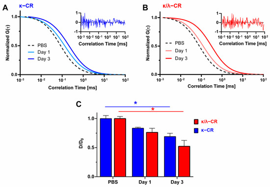 Next, κ-CR and κ/λ-CR hydrogels (5% w/v) were incubated in 3 mL of PBS at 37 °C for 1, 2, or 3 days. Releasate samples were removed and stored at 4 °C until FCS analysis. FCS samples were prepared by gently mixing 100 µL of hydrogel releasate or PBS with Atto 655-labeled RNase A for a final protein concentration of 1 µg/mL. Sample solutions (40 µL) were loaded into perfusion chamber gaskets adhered to a #1.5 coverslip and capped to avoid evaporation. FCS measurements were performed using Microtime200 software (PicoQuant, Berlin, Germany). Atto 655 (0.2 nM) in PBS was used to calibrate the FCS instrument confocal volume. A 640 nm ps pulsed laser was used at an optical power of ~11.4 µW for at least six measurements of 180 s for each sample. An autocorrelation function G(τ) was obtained for each measurement:
