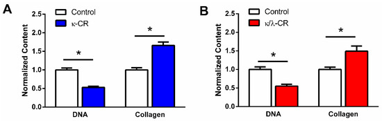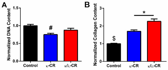 Effect of Hydrogel Confinement on DNA and Collagen Accumulation. DNA and collagen content were measured following 7 d in environment confined by either κ-CR (A) or κ/λ-CR hydrogels (B). Results were normalized to the Control (No CR) group. * indicates statistically significant difference between the CR group and Control (no-CR) group (n = 4, p < 0.05).