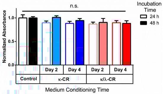 Metabolic Activity Following Incubation in Conditioned Medium. Metabolic activity was measured 24 h and 48 h after cell cultures were treated with medium conditioned by soaking κ-CR or κ/λ-CR hydrogels for two (D2) or four (D4) days in the incubator. Control group was unconditioned (no CR). Results were normalized to the control group for each time point. “n.s” denotes that no statistically significant difference was observed (n = 3).