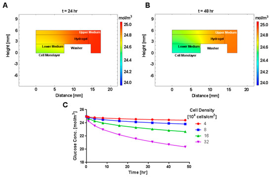 Glucose transport simulations were conducted for a 48 h period using a time step of 300 s. The initial value for the concentration of glucose in the culture medium was 4.5 g/L to match the medium formulation in the cellular experiments, and this was applied to all regions of the culture medium and the hydrogel. Diffusivity of glucose in the culture medium was assumed equal to the diffusivity of glucose in water at 37 °C, given as 6.14 × 10−10 m2/s by Zhou et al. [47]. Considering the low weight percentage of CR molecules used to formulate the hydrogel layer in the cellular experiments, glucose diffusivity in the hydrogel layer was also assumed to be equal to its diffusivity in water at 37 °C. Simulations of oxygen transport used a steady-state transport model (Equation (6)) due to the infinite source of oxygen from air within the incubator.