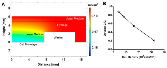 Computational Modeling of Oxygen Concentration. (A) Heat map of steady-state model of oxygen concentration at a cell density of 4 × 104 cells/cm2. (B) Calculated oxygen concentration as a function of cell density at the cell monolayer (height = 0) at the center of the well (radial position of 0), where Ci is the initial concentration of oxygen at the source in contact with the upper medium boundary.