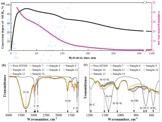 (a) Conversion rate of -OCH3 of the MTMS solution catalyzed by the OA aqueous solution (cOA = 38.4 mmol/L) and colloidal particle size within the MTMS sol as a function of th. Notes: the conversion degree of −OCH3 (η) quantifies the hydrolysis degree of MTMS solutions, which was calculated by Equation (1). The colloidal particle sizes within the MTMS solution at various th were determined by the static and dynamic light scattering instrument (ALV/CGS-3, ALV-Laser Vertriebsgesellschaft m-b.H., Langen, Germany) with a fixed scattering angle of 90°. FTIR spectra of as-synthesized sol samples with various th: (b) wavenumber of 4000–1200 cm−1, and (c) 1200–750 cm−1. Notes: The th for sol Samples 7–11, 2, and 12–14 was 10 min, 30 min, 45 min, 60 min, 105 min, 120 min, 135 min, 180 min, and 1440 min, respectively.