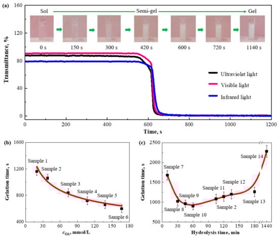 (a) Photos of sol Sample 2 during the gelation process and its ultraviolet, visible, and infrared light transmittance with time. Influence of (b) cOA and (c) th on the gelation time of MTMS sol.