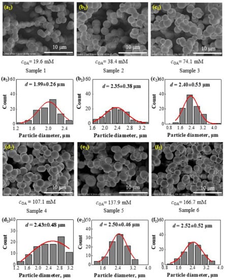 Effect of cOA on the (a1–f1) microstructure and (a2–f2) particle size distributions and average particle size of as-synthesized MSQ aerogel samples.