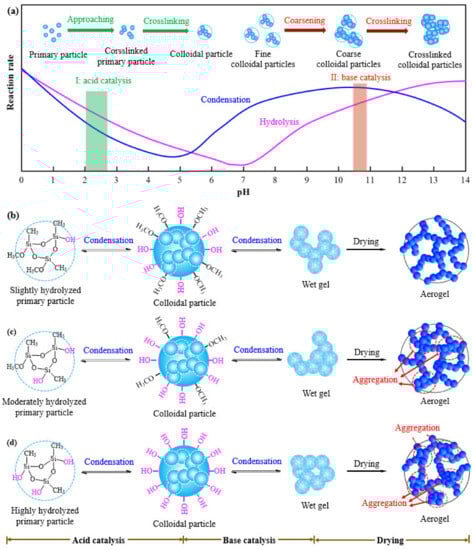 (a) Diagram of relative hydrolysis and condensation reaction rates of a silica precursor versus solution pH (reproduced from Ref. [56]) and particle growth and crosslinking mechanism in two-step acid/base catalytic sol-gel process. Schematic diagram of aerogel microstructure formed by (b) slightly, (c) moderately, and (d) highly hydrolyzed primary particles during the two-step acid/base catalytic sol-gel and drying process. Notes: (a) is drawn based on the sol-gel kinetics of tetraethylorthosilicate (TEOS). Due to the presence of methyl groups directly bonded to Si atom, MTMS may exhibit biased reaction rates at different pH values (there is no relevant data in the existing literature, and we do not have experimental testing conditions).