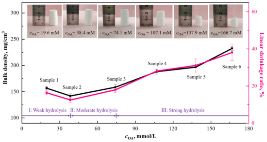 In contrast, the bulk density of as-synthesized MSQ aerogels (see Figure 7) first decreased from 156.8 to 141.9 mg/cm3 when the cOA value was in the range of 19.6–38.4 mmol/L and then increased significantly to 232.4 mg/cm3 when the cOA value was in the range of 38.4–166.7 mmol/L. The linear shrinkage ratio of the as-synthesized MSQ aerogels showed a similar trend as cOA increased from 19.6 mmol/L to 166.7 mmol/L. This finding can be related to the aggregations of colloidal particles caused by condensation and shrinkage of the wet gel due to the capillary force during the APD process [57,58].