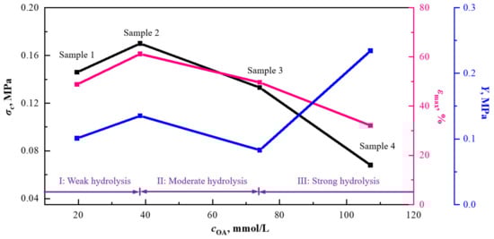 The ratio of the number of Si-O-Si bonds that have been formed to those that can be theoretically formed changed over time, relying on the initial concentration of reagents, temperature, and catalysis environment [53]. The GT of MTMS sols (see Figure 3b) decreased significantly from ~1160 s to ~600 s as the cOA increased from 19.6 mmol/L to 166.7 mmol/L. This finding was caused by the following two reasons. On one hand, the increased dose of cOA increased the water content in the MTMS sol as the OA aqueous solution contained 99.87 wt.% deionized water. The high-water content in MTMS sol could accelerate the hydrolysis process of MTMS solution and generate a high content of Si-OH in MTMS sol, acting as sources for the positive reactions (i.e., condensation reactions) shown in Scheme 1b,c. The gelation rate of MTMS sols was consequently accelerated. On the other hand, the hydrolysis rate increased with increasing cOA, which led to a faster condensation rate after the addition of ammonia [37].