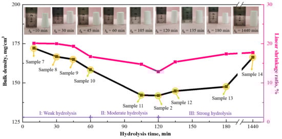 As shown in Figure 9, all the aerogel samples exhibited a complete macroscopic morphology without cracks, but there were noticeable size inconsistencies in the upper and lower parts of aerogel Samples 7, 8, 13, and 14, which were not observed in aerogel Samples 9–12, and 2. Therefore, monolithic MSQ aerogels with intact and consistent macroscopic morphology could only be obtained when th was 60–135 min. Too high (>135 min) or low values (<60 min) of th would easily lead to defects in the as-synthesized MSQ aerogels. Besides, as th increased from 10 to 120 min, the bulk density of MSQ aerogels reduced significantly from 172.2 to 141.9 mg/cm3 and their linear shrinkage ratio decreased from 20.1% to 12.9%. However, as th continued to increase from 120 to 1440 min, the bulk density and linear shrinkage ratio of as-synthesized MSQ aerogels no longer decreased, but instead increased from 141.9 to 166.3 mg/cm3 and 12.9% to 17.9%, respectively. This finding was related to the growth and crosslinking mechanism of the colloidal particles during the sol-gel process. Under the weak hydrolysis conditions (th < 60 min), as the silica particles were negatively charged and repelled each other, they preferentially grew instead of colliding with each other, without the aggregation of the particles in the gelation process. This in turn led to a poorly Si-O-Si linked inorganic network upon condensation, making it difficult to resist stress during drying, resulting in a significant linear shrinkage ratio and bulk density of the MSQ aerogels [61]. Under moderate hydrolysis conditions (60 min ≤ th ≤ 120 min), the abundant Si-OH on the colloidal particle surface enabled them to aggregate with each other through condensation reactions. The high -CH3 concentration on the wet gel surface might produce large repulsive forces, causing a “spring-back” effect of the gel network to resist the linear shrinkage during the APD process [62]. However, under strong hydrolysis conditions (th > 120 min), over-crosslinked particles would aggregate excessively, resulting in a higher linear shrinkage ratio and bulk density of the as-synthesized MSQ aerogels.