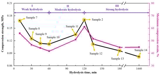 The compression strength-hydrolysis time curve (see Figure 10) falls into three stages: (I) weak hydrolysis conditions (th < 60 min), (II) moderate hydrolysis conditions (60 min ≤ th ≤ 120 min), and (III) strong hydrolysis conditions (th > 120 min). The compression strength of the as-synthesized MSQ aerogels decreased dramatically from an initial high value of 0.168 MPa to 0.125 MPa when th increased from 10 to 45 min, then gradually rose to 0.170 MPa when th further increased to 120 min, and finally significantly fell back to 0.081 MPa. The variations in the compression strength of the as-synthesized MSQ aerogels were related to the microstructure of MSQ aerogels. As shown in Figure 5, the silica network in aerogel Samples 7–9 (th < 60 min) is less connected (i.e., many one-to-one connections), while the particles (d = 1.91–2.68 μm) within the network are rather large. In contrast, the silica particles within the aerogel Samples 10, 11, and 2 (60 min ≤ th ≤ 120 min) are well connected (i.e., many one-to-many connections). Although their particle size is around 2.30 μm, the particles could aggregate together to form a thick and strong skeleton. Although further increasing th (>120 min) could make the particle connections denser, the large linear shrinkage ratio (i.e., 15.4–17.7%) of wet gel might cause microcracks among the particle-to-particle connections while weakening the compression strength. The maximum compression strain of the as-synthesized MSQ aerogels exhibited a similar pattern. Therefore, the optimum values of cOA and th for the MTMS precursor solution are 38.4 mmol/L and 120 min, respectively. These process parameters endowed the as-synthesized MSQ aerogels with a compression strength of 0.170 MPa and a maximum compression strain of 61.2%. The results of this work thus challenge the common paradigm that silica precursors need to be hydrolyzed for a long time, even to rest overnight, to produce high-quality silica aerogels.