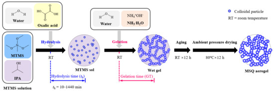 First, ethanedioic acid dihydrate (EAD) and pure ammonia water (NH3∙H2O) were dissolved in deionized water separately to form an oxalic acid (OA) aqueous solution with a 10 mmol/L and NH3∙H2O aqueous solution with a 4.0 mol/L, respectively. Then, 2.0 mL of MTMS and 4.0 mL of IPA were blended under magnetic stirring for 10 min to form an MTMS solution. Thereafter, the pH of the MTMS solution was adjusted to ~2.5 through the addition of 0.2–2.0 mL as-prepared OA aqueous solution and 4.0 mL deionized water. The MTMS solution was hydrolyzed at room temperature (RT, 20 ± 5 °C) and acidic conditions for various periods (i.e., th = 10, 30, 45, 60, 105, 120, 135, 180, and 1440 min), forming an MTMS sol. Afterward, the pH of the MTMS sol was adjusted to ~10.5 through the addition of 0.9 mL as-prepared NH3∙H2O aqueous solution. After stirring at 400 rpm for 1 min, 5.0 mL MTMS sol was decanted into an air-tight polypropylene centrifugal tube (Φ15 mm) and left to stand at RT and covered with a polyethylene protective film until transformed into a wet gel (dimensions: Φ15 mm × 28 mm). MTMS-derived MSQ aerogel samples were synthesized after aging at RT for 12 h and drying at 80 °C for 12 h of the wet gels.