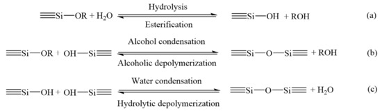 - Brochier Salon, M.; Belgacem, M.N. Competition between hydrolysis and condensation reactions of trialkoxysilanes, as a function of the amount of water and the nature of the organic group. Colloids Surf. A 2010, 366, 147–154. [Google Scholar] [CrossRef]