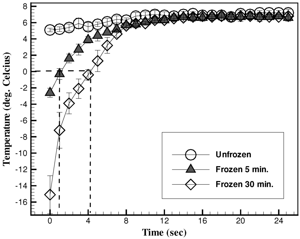 Heating Curves for Canvas: The canvas was wetted on both sides according to the procedure described earlier and placed in a freezer for a duration of 5 and 30 min, corresponding to the two cases of frozen canvas. The freezing times were chosen under the assumption that freezing longer would allow us to maintain the surface as a solid for longer period. The time interval between removal of the canvas from the freezer and the start of the experiment was about 10–15 s. Therefore, no significant melting of the canvas would have occurred during this time. To verify how the temperature of the canvas changed with time, we measured the average surface temperature of the canvas in all three cases using a hand held infrared thermometer (General IRT 206 Infrared Thermometer, Taiwan). The Figure 2 shows the “heating curves” for all three cases which reveals the classical Newtonian profile. After approximately 10 min, the temperature of all the three canvases reach a common temperature and very slowly converge to room temperature. The melting temperature for the two frozen canvases are approximately at the 1 min and 4 min mark indicated by the dashed lines in the Figure 2. Prolonged residence times in the frozen state results in reduced viscous resistance for the paint to disperse on the canvas.