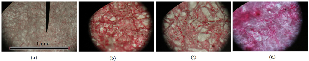 Closeup view of the three canvases used in this study showing their surface features and porous nature. The pictures were taken with a Leica CME microscope (Meyer Instruments, Houston, TX, USA) at magnification of 100×. Images (a)–(c) correspond to 90 lb, 140 lb and 140 lb cold pressed canvas, respectively. The image (d) is of stained, uncoated printing paper at the same magnification.