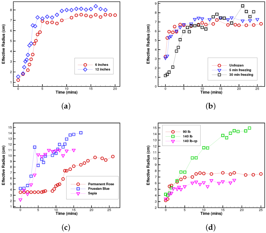 The effective diameter of each splash was measured in centimeters, approximated by the largest width of the splash. The effective radius for each droplet was repeatedly measured continuously over time intervals of the order of a minute from the time of impact to the equilibrium state when the paint eventually dried on the paper (see Figure 4). Figure 5 depicts the evolution of the effective radius of the splash as a function of time. In particular, the figure shows a representative image of the impact of: height of droplet, temperature of the canvas, surface roughness of the canvas and viscosity of the paints upon this saturating curve. One can clearly see the impact of some these parameters more strongly than others from the figures. The effective radius of the paint is most affected by the paint type and nature of canvas (Figure 5c,d) which can be attributed to the varying frictional forces caused by the different pigment concentration of the paints and surface roughness of the canvas, respectively. The temperature of the canvas (Figure 5b) also shows interesting trends in the initial phase when surface characteristics are different. However, the true impact of all the parameters can be procured only by means of some more rigorous statistical means. Statistical analyses were conducted for the 46 different cases that were studied and correlations between the size of splash and the various control parameters are best determined using these tools. The statistical correlations are discussed below in Section 5, but, in the rest of this section, we discuss some other specific quantitative features, drawing upon similar work in the literature on slightly different systems.