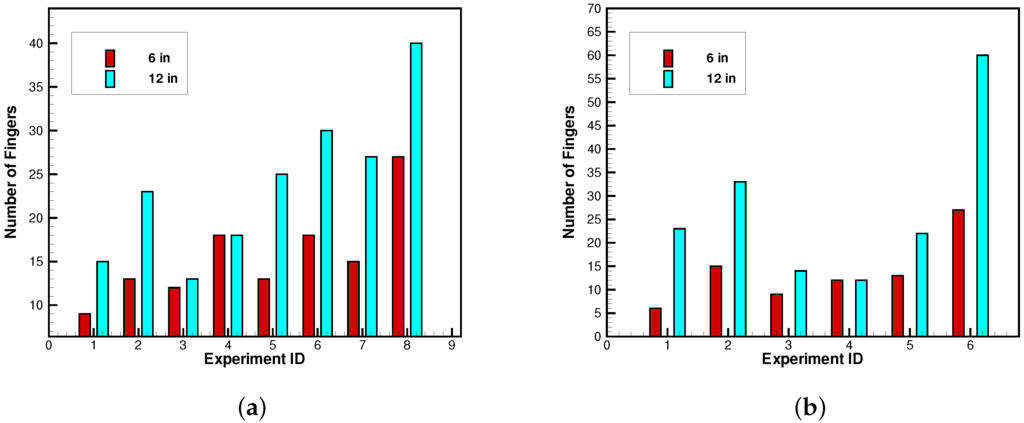 Following the work of Marmanis and Thoroddsen [], we estimate the “number of fingers” as a function of height for various cases that show clear fingering patterns. As in [], “...everything that resembles a finger, no matter how short...” is regarded a finger. The exact number of fingers however, is difficult to determine and the numbers reported must be realized to be approximate. Figure 8 depicts some sample cases of our analysis, which shows the count for the two different heights considered in this study ( and ) and two different paints (Permanent Rose and Prussian Blue). Clearly, in both cases, the height, or impact velocity is directly related to the number of fingers (also noted in []). In addition, the viscosity of the paint is inversely related to the number of fingers seen from comparing the two graphs Figure 8a,b. Other potential factors are more difficult to identify directly from the count and are dealt with in the following Section 5.