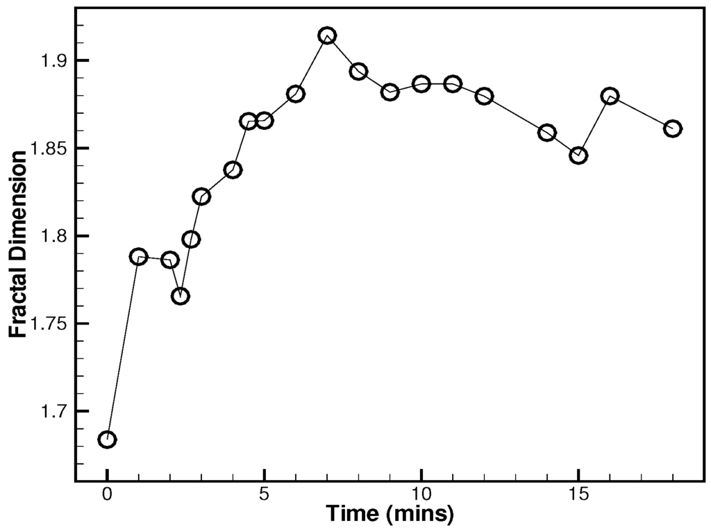 The time evolution of the fractal dimension was also computed and shows a similar overall profile to the effective radius. Figure 10 shows a sample curve corresponding to the images in Figure 4. However, this curve does not display a power-law correlation. The factors affecting the fractal dimension are discussed in the following section.