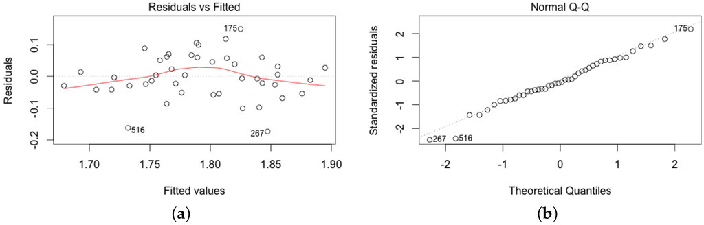 Residual against fitted value plot for multiple regression model of fractal dimension. Normal Q-Q plot for multiple regression model of fractal dimension.