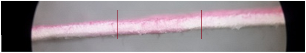 To qualitatively understand the effect of canvas porosity, we took a few images of the cross sectional slice of a droplet splash stain done about 5 min after the experiment, when the paint had not had a chance to evaporate. The image was obtained with a confocal microscope set at a magnification of about 300. The Figure 12 reveals some penetration, inferred from the pinkish hue of the paint at the center, i.e., the impact point, with not much absorption (at least not at this scale) elsewhere in the observed time. We therefore believe that while absorption might play some role at the early stages of the spread and paint penetration might continue to play a small role at later times as well. Therefore, the phenomenon still maintains the same overall properties as in the case of non-porous surface. In the case of 30 min canvas freezing, the surface is frozen and stays as such for several minutes past impact reducing the absorption time. Therefore, in this case, viscous and capillary regimes could dominate the absorption phase. Absorption dynamics appears to occur in two extremes of time scales: (a) the very short time impact scale where the maximum penetration is likely to occur and (b) the very long time scales where slow diffusion into the canvas occurs in the liquid-post-molten state of the canvas. Both these phases need further investigation.