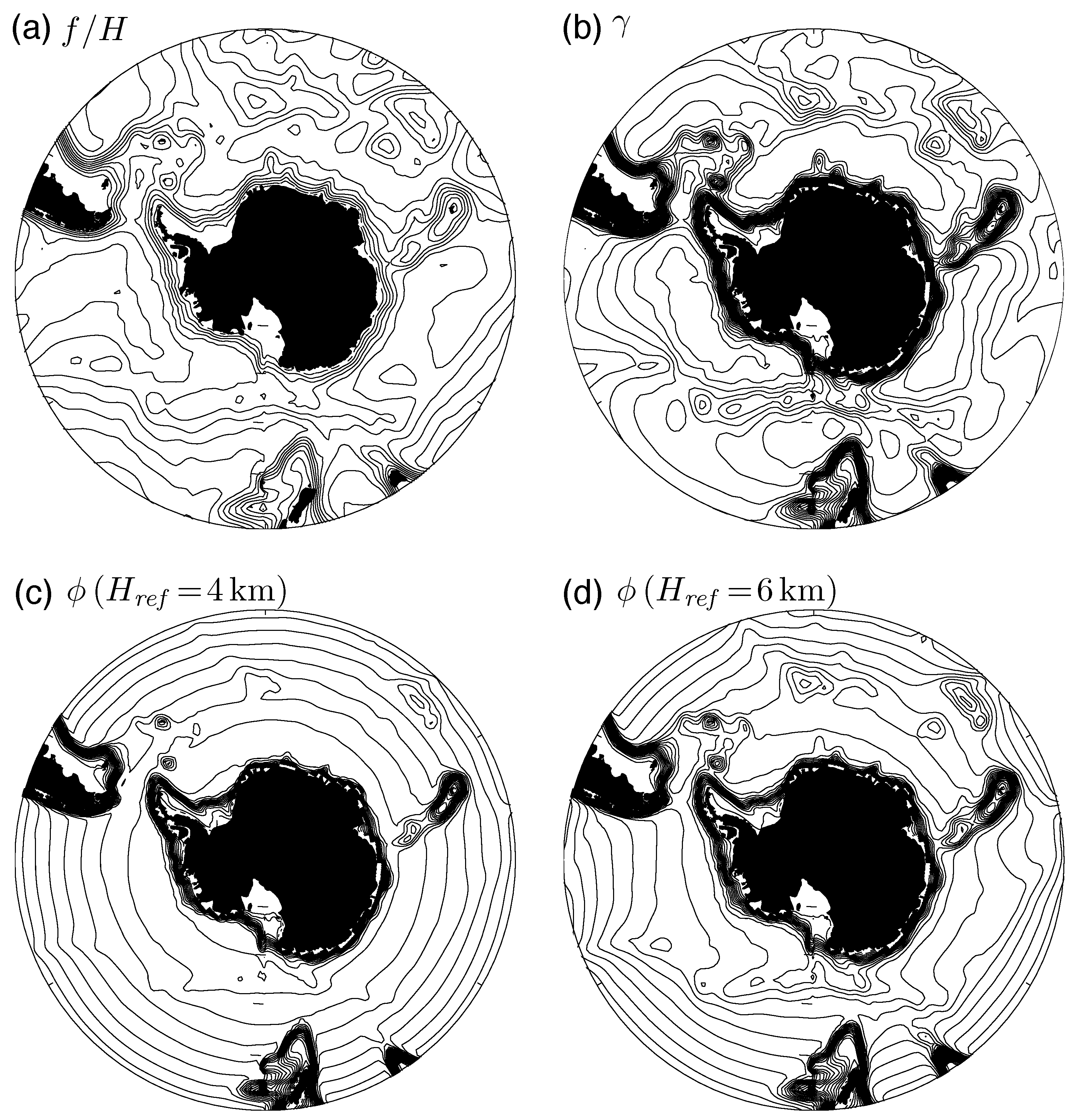 Plotted in Figure 2 are contours of , γ (Equation (17)), and for and . Note that the characteristic contours, , are quasi-zonal for these parameter choices, with only slight deflections over the major topographic, in marked contrast to both and γ. The Kerguelen Plateau (between about E, in the Indian sector) is notable in representing a more substantial topographic obstacle.