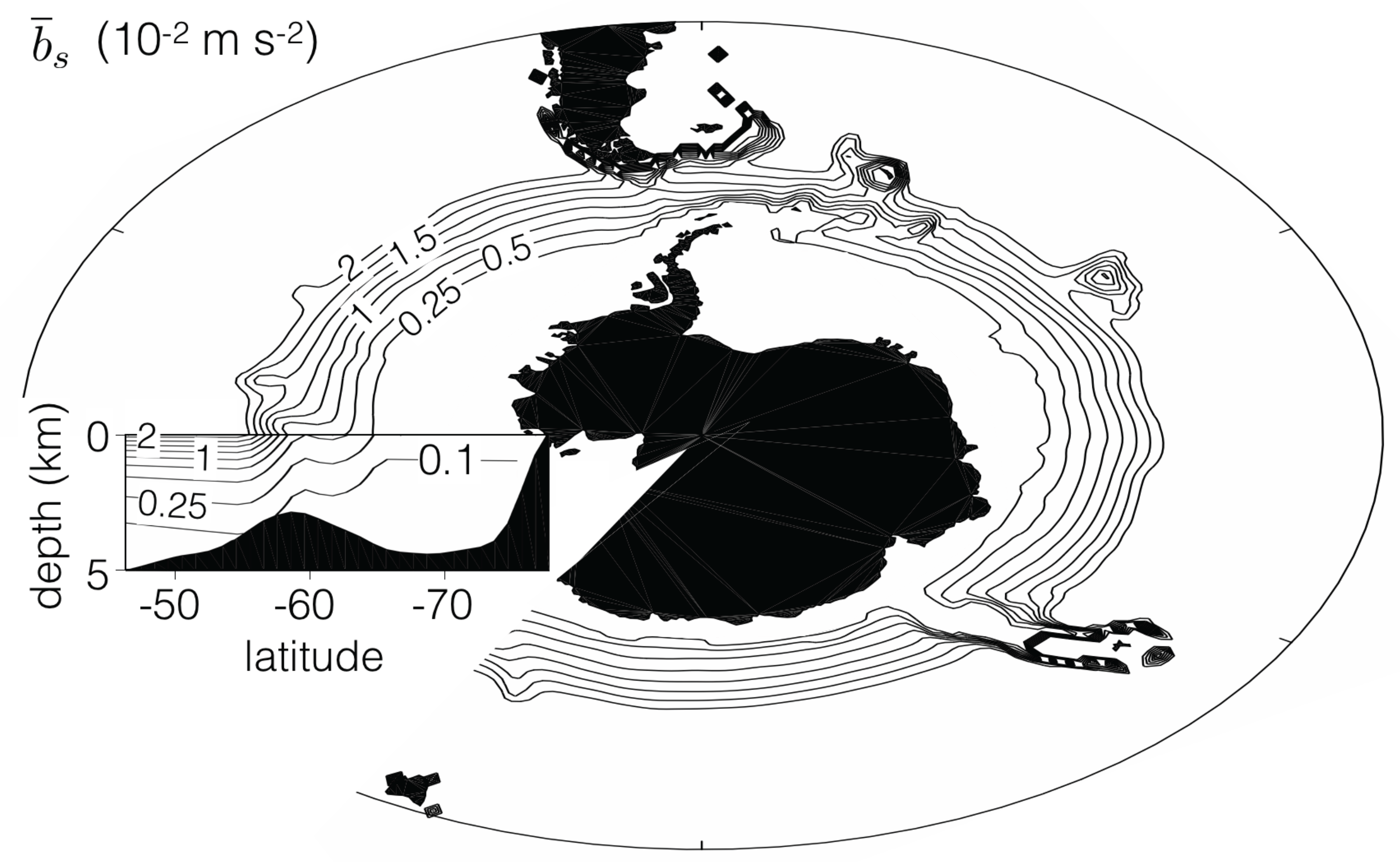 The flow is quasi-zonal over most of the water column with only modest excursions over the topographic features. The two most obvious exceptions are in the Drake Passage where most, but not all, of the streamlines are able to pass through the passage, and the Kerguelan Plateau, which acts as a complete barrier to the modelled ACC. In reality, the ACC flows several degrees further north in the Indian sector and hence is able to skirt the northern tip of the Kerguelan Plateau. The latter is a limitation of the present model which lacks the necessary dynamics to allow the current to deflect northward after passing through the Drake Passage and return poleward as it passes around Antarctica. Traditionally, the latter has been assumed to be a consequence of Sverdrup balance following Stommel [23], although more recent work points to an important role for mesoscale eddies in controlling these meridional excursions [24].