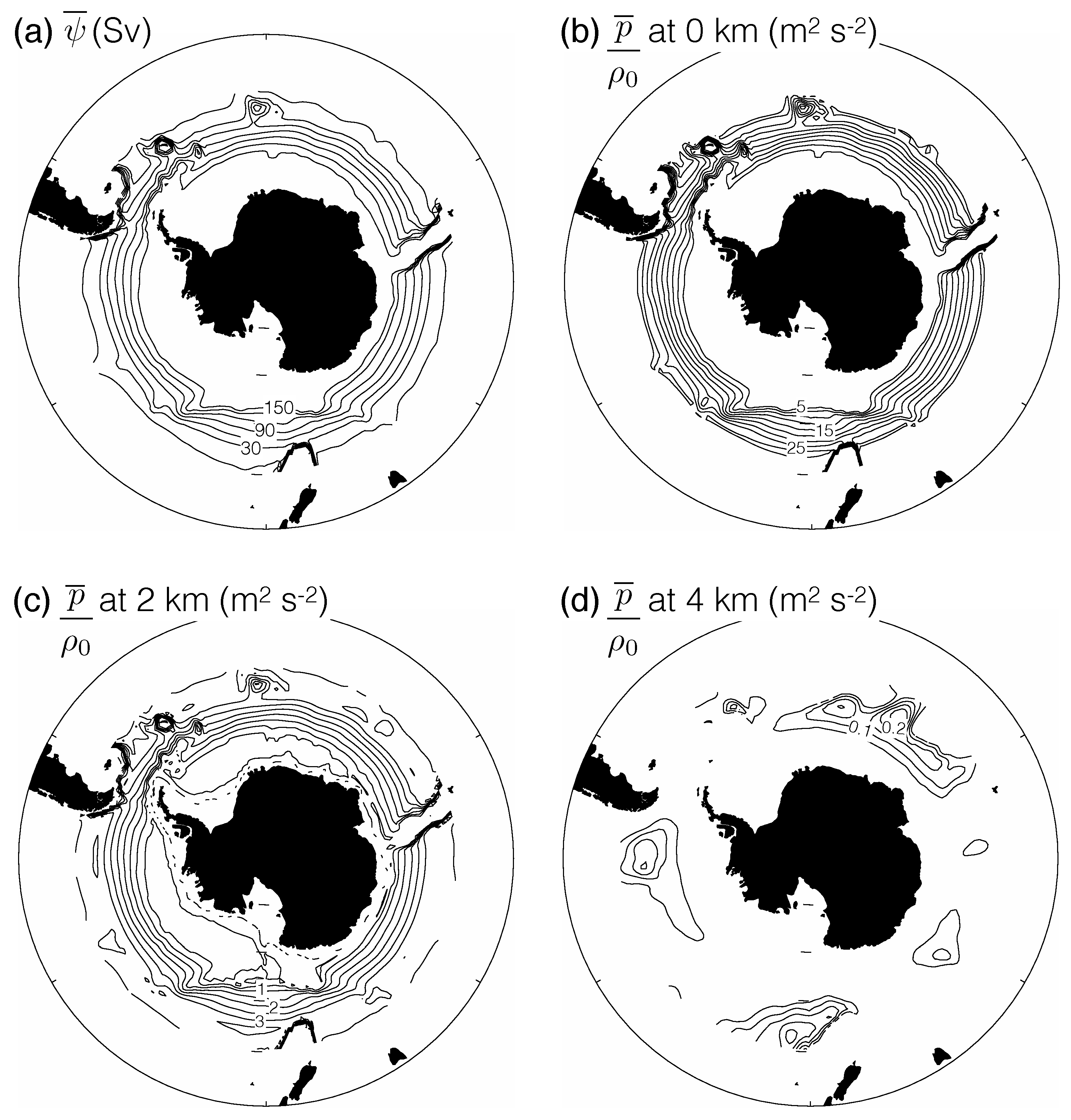 The model analysed in this paper relies on a number of overly restrictive assumptions. Firstly, the assumption of planetary geostrophic dynamics clearly breaks down in the presence of major topographic obstacles such as the Kerguelan Plateau, where inertial boundary layers, separated jets and short Rossby waves are each generated, e.g., [38,39,40]. Secondly, the ansatz of uniform potential vorticity on density surfaces is a convenient analytical and conceptual device in isolating the dynamical effects of the boundary conditions from the interior dynamics but is an extremely crude model of the hydrography observed in the Southern Ocean. More general functional relations between the mean potential vorticity, buoyancy and Montgomery potential will result in higher baroclinic Rossy wave modes, which are excluded in the present model. Thirdly, the model has excluded any explicit wind and buoyancy forcing, although such forcing is included in the more general theoretical approach of Salmon [15]. Fourthly, the effects of compressibility, and the separate contributions to the buoyancy from temperature and salinity, have been completely ignored. While common in practise in theoretical models of the ocean circulation (see [18,41]) for reviews, this simplification is purely for analytic convenience and not justified; the duality noted by [42] between the Boussinesq and non-Boussinesq hydrostatic equations of motion may provide a means of incorporating compressibility effects in a more consistent manner cf. [43,44].