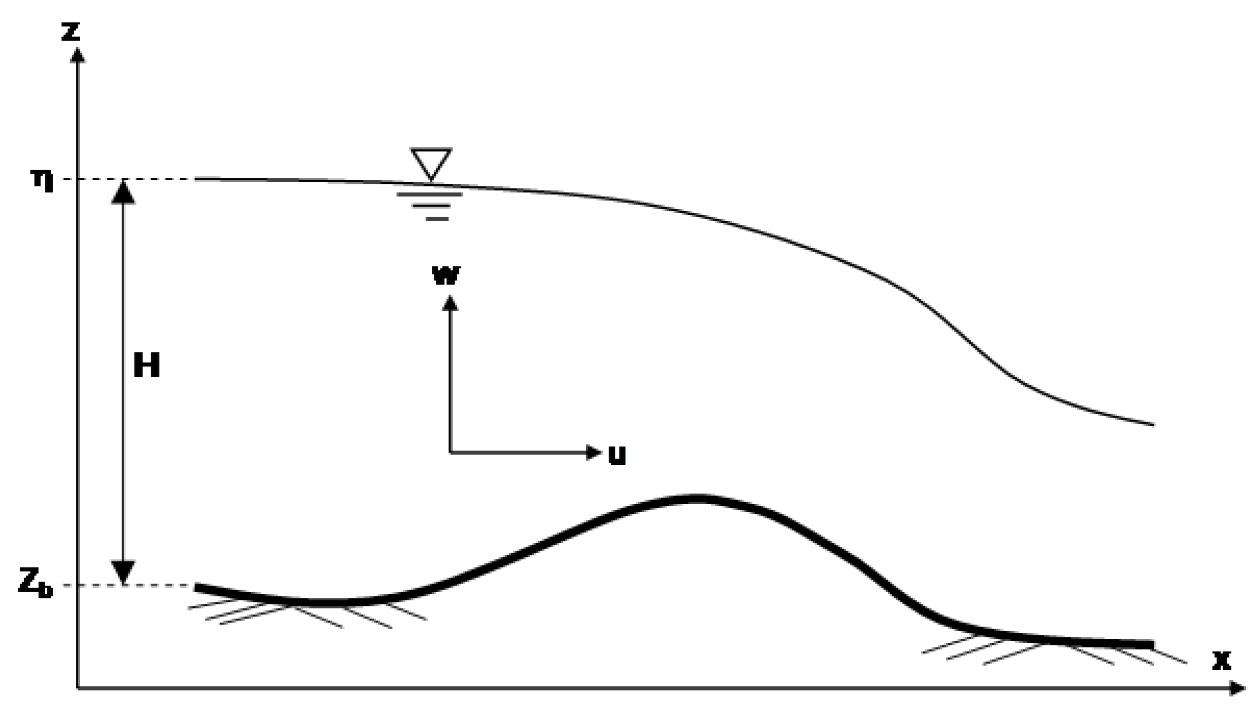 Substituting Equation (3) in Equation (2) and vertically integrating from z to gives an equation for the vertical velocity distribution after employing the kinematic boundary condition, , at the free surface: