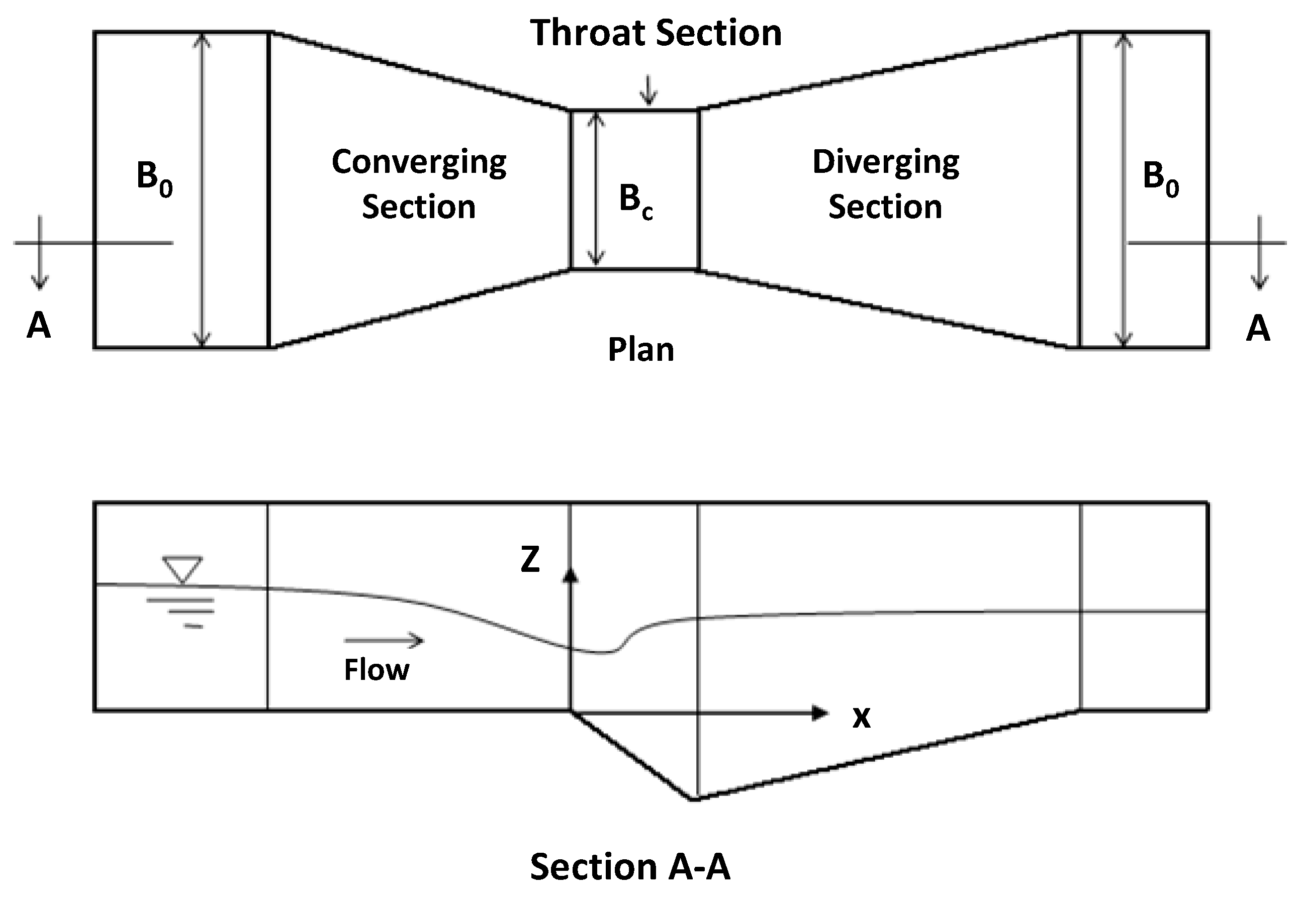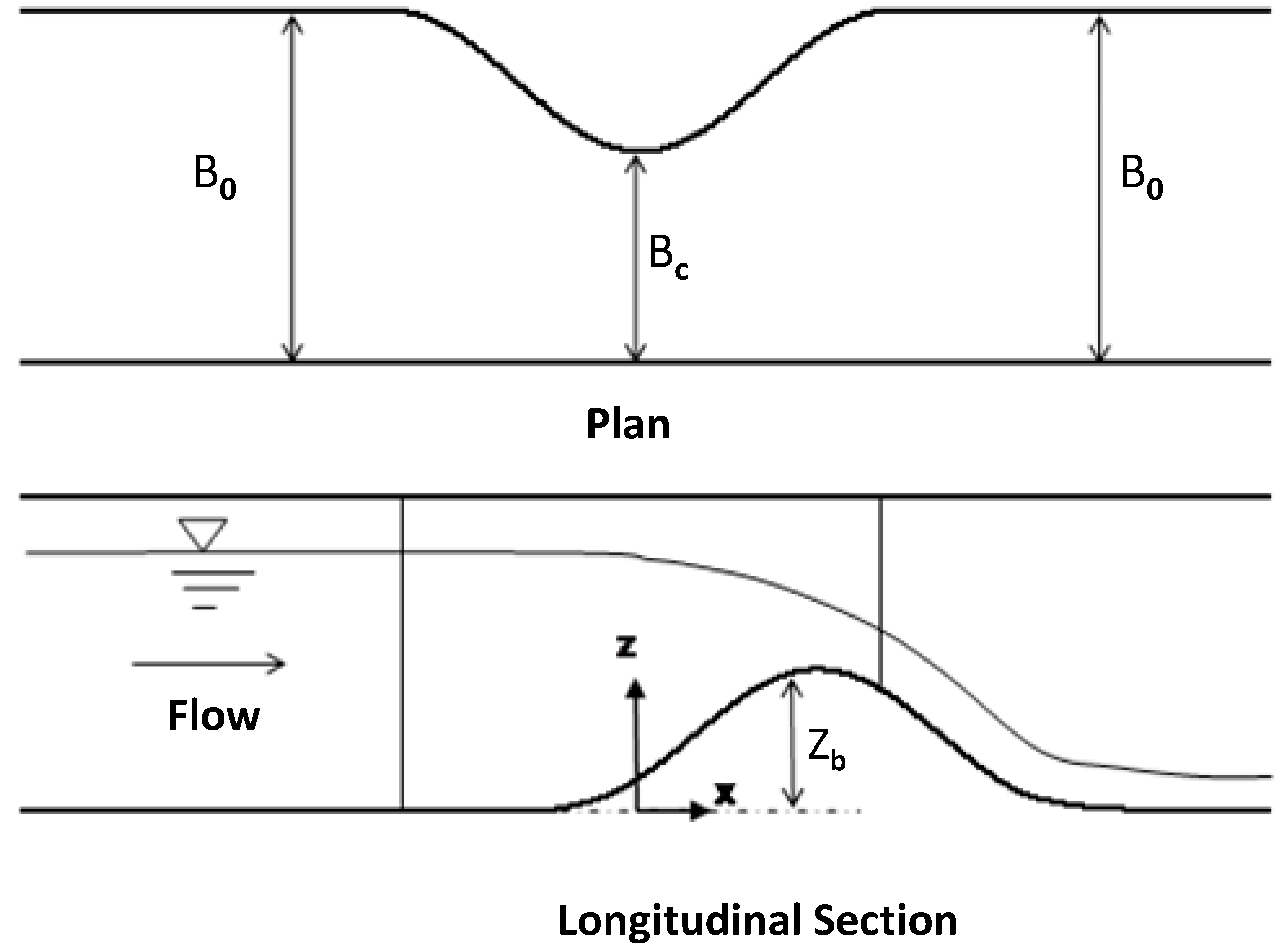 A Venturi flume is a critical-flow flume, wherein the critical depth is created by a local diminution of the channel width. For open channel conveyance systems, the Venturi flume offers the simplicity of a direct correlation between the upstream head and a corresponding discharge. Compared to a weir, this flume possesses the advantages of operating successfully without significant deposition of sediments and conveying water with smaller energy losses [1]. If the Venturi flume is designed to be operated under free flow conditions, the flow passes from the subcritical to the supercritical state through the flume channel. In a long-throated flume, the prismatic throat section has a sufficient length in the streamwise direction to achieve a nearly parallel flow situation and a hydrostatic pressure distribution (see, e.g., [2]). Contrary to this, the flow pattern in the control section of a short-throated flume is characterised by a strong free surface curvature and a departure from the hydrostatic distribution of pressure [3,4,5]. In a bottom hump type of such flume, the combined effects of the sidewalls and streamline vertical curvatures predominantly affect the behaviour of the curvilinear flows, especially in the vicinity of the critical section where the flows exhibit three-dimensional (3D) characteristics with cross-waves. In the region downstream of the critical section, the cross-waves influence the configuration of the free surface profile. Furthermore, the pattern of the curvature of the streamlines is influenced by the contraction ratio and the shape of the diverging section [3]. The detailed description of the flow field of a short-throated flume requires a higher-order numerical model that includes more detailed information in the form of vertical velocity and non-hydrostatic pressure distributions, as well as the effect of the curvature of the sidewalls. Several previous studies focused only on the simulation of curvilinear flows over sills (see, e.g., [6,7,8,9,10,11]). In comparison, detailed numerical investigations have not been systematically carried out for free flows in Venturi flumes with and without bottom humps using a higher-order one-dimensional model. From the practical point of view, an accurate one-dimensional non-hydrostatic model can effectively supplement experimental studies for developing discharge rating curves and studying the hydraulic behaviour of full-scale Venturi flumes.
