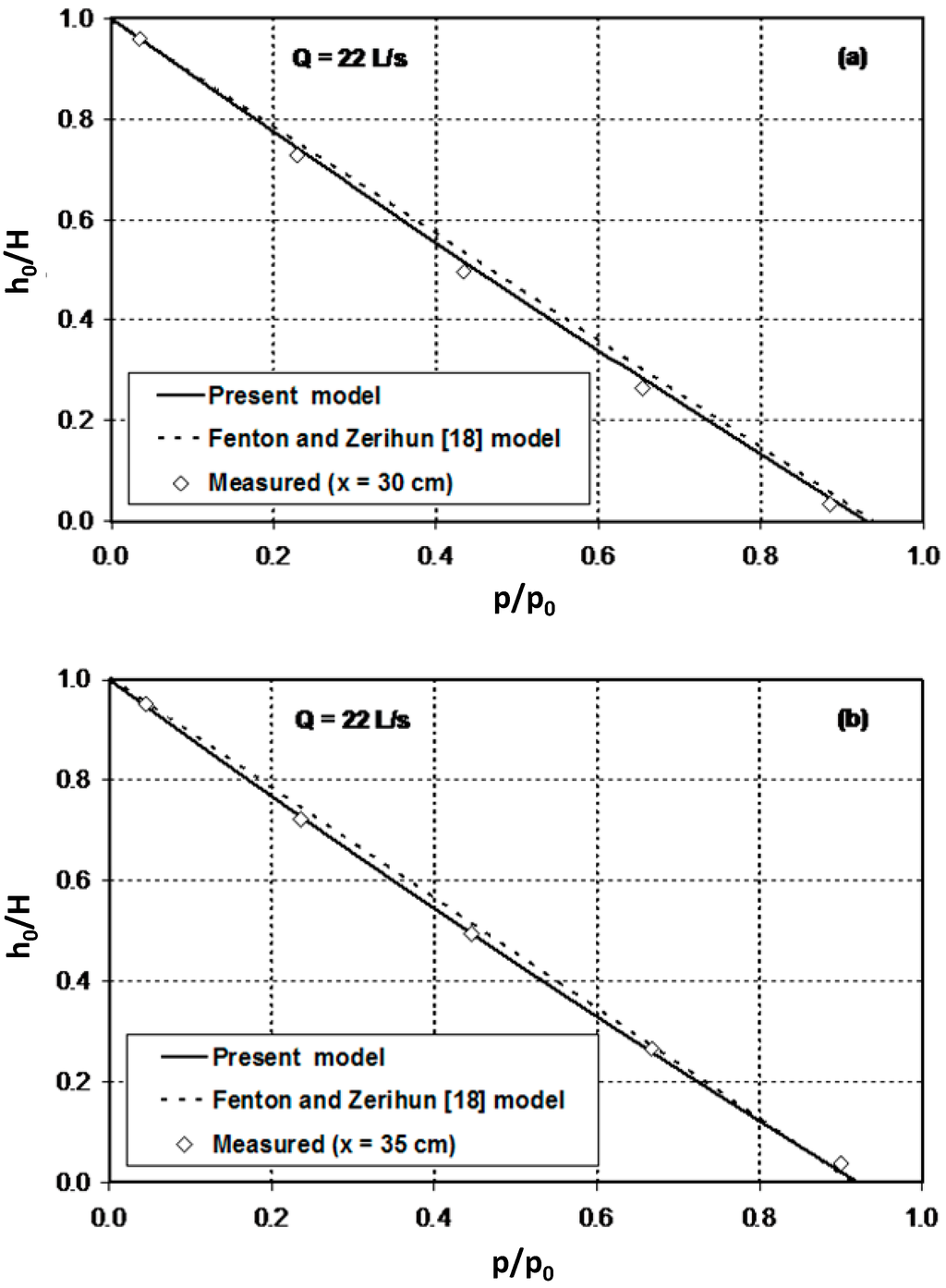 For assessing the impact of the applied corrections for the effects of the sidewalls and streamline vertical curvatures in the simulation results of the model, the vertical distributions of the pressure at the upstream () and downstream () ends of the throat section are modelled. In this section of the flume, the effect of the curvature of the sidewalls might not be expected to be significant. Figure 6 compares the computational results of the present model for pressure distributions against the experimental data points. The numerical results of Fenton and Zerihun’s [18] model are also plotted. In this figure, the variation of the normalised pressure, ( is the pressure at a vertical distance of above the bed, ), with the normalised vertical distance above the bed, , is shown. In both simulation cases, the predictions of the present model compare favourably to the experimental data and show a slight improvement against the predictions of the Fenton and Zerihun [18] model. The maximum relative errors for the present model and Fenton and Zerihun’s model are only 1.3% and 3.5%, respectively.