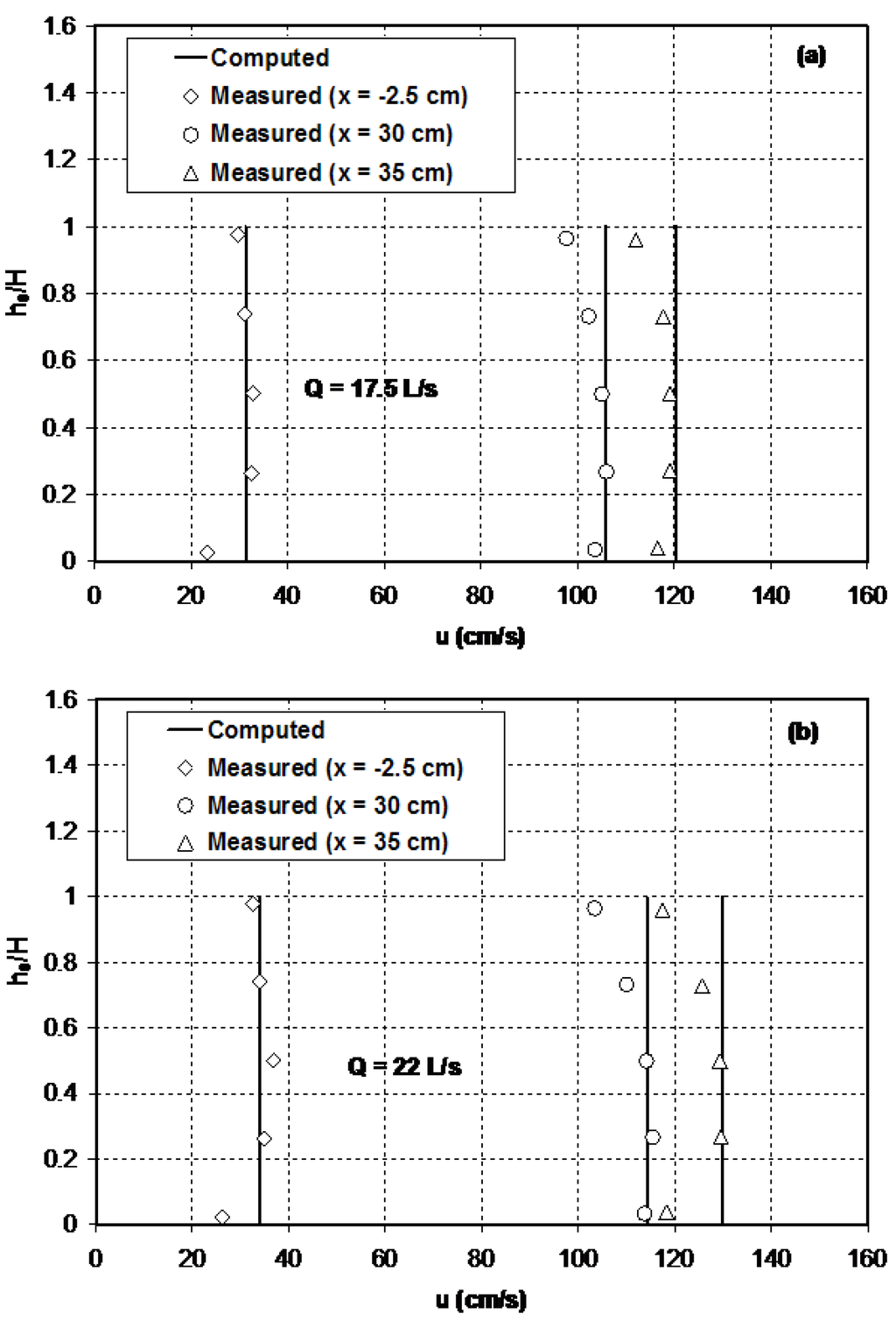 Figure 7 compares the computed horizontal velocity profiles with the laterally-averaged measured data. Although the assumed constant vertical profile for the horizontal velocity distribution is an approximation, the computed results agree fairly well with the measurements for this test case. As can be seen from Figure 7, the flow in the narrow section of the flume attains maximum velocity at a point beneath the free surface. The values of the Boussinesq coefficient, , were estimated for the measured velocity data using a numerical procedure developed by Zerihun [33]. For the test case considered here, its value varies between 1.01 and 1.04.