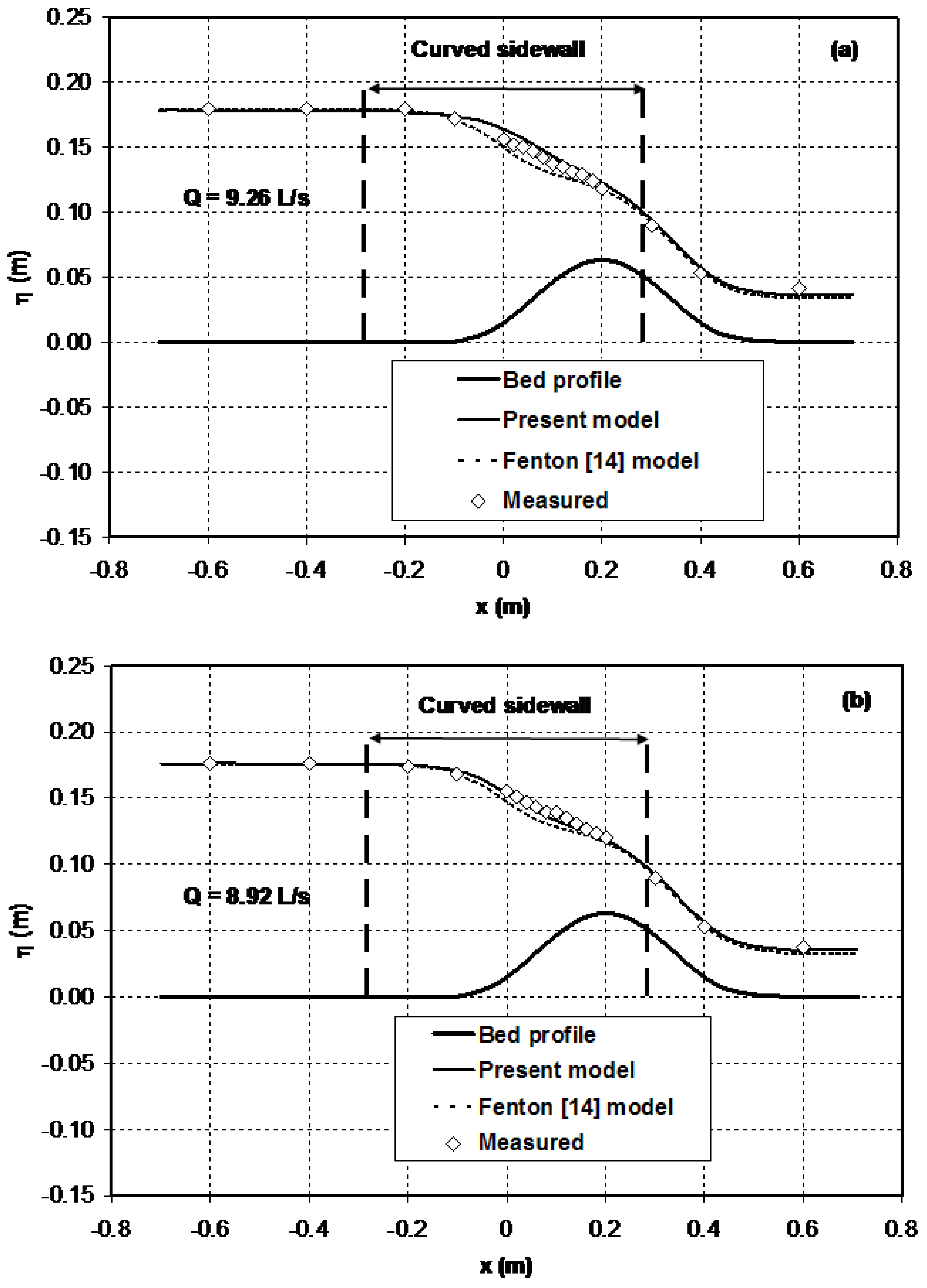 Figure 9 compares the computational results of the present model with experimental data. It also depicts the comparison of the predictions of the present model with previous results obtained by Zerihun [33] using Fenton’s [14] equations. In the upstream subcritical flow region, the agreement between the results of the numerical models and the experimental data is remarkable. Similar performance results can be seen in the supercritical flow region downstream of the maximum height of the hump. In general, no significant differences are observed between the numerical results of the two models in these flow regions. In the vicinity of the critical section where the combined effects of the sidewall and streamline vertical curvatures are substantial, the results of the present model compare well to the experimental data (maximum relative error = 1.6%) and are marginally better than earlier numerical results (maximum relative error = 3.5%) obtained by Zerihun [33]. The discrepancy of Fenton’s [14] model results from measurements in this region is attributed to the effect of sidewall curvature. For this test case, the relative bed curvature, ( = curvature of the bed), of the flows varies from 0.29 down to −0.28. This implies that the validation scenario represents a case of transcritical flow over a moderately curved bed. Despite the flow exhibiting 3D characteristics in the vicinity of the critical section, especially at higher discharge, the performance of the present model for this test case is satisfactory.