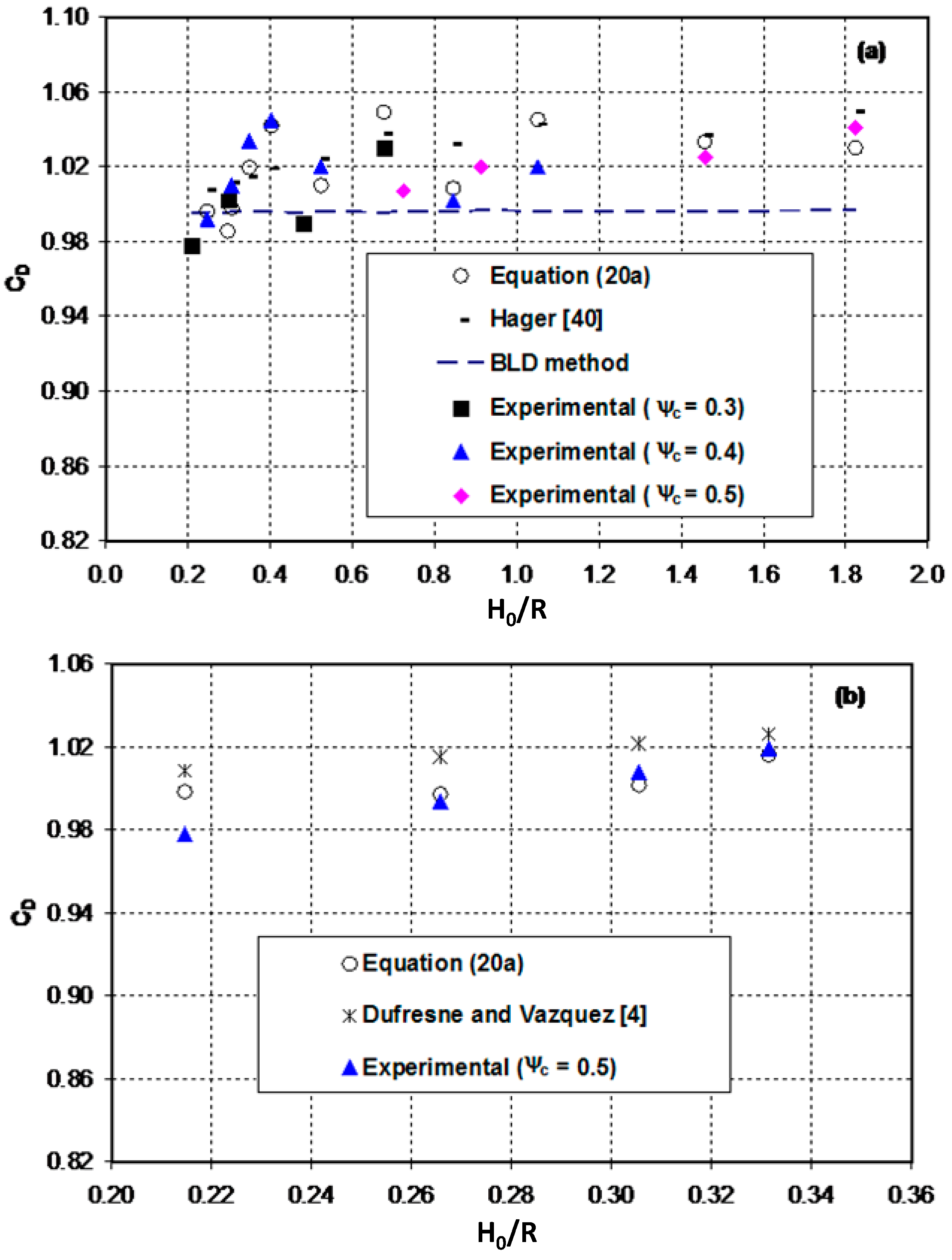 The discharge coefficients computed from Equation (20a) for free flows in short-throated flumes are compared to Khafagi’s [37] experimental data in Figure 11a. The figure also shows the results of the boundary layer displacement (BLD) method [42,43] and Hager’s [40] approach. It can be seen from this figure that the agreement between the result of the present method and the experimental data is reasonably good (maximum relative error < 3.5%). Compared to the present method, the BLD method underestimates the discharge capacity of the flume. As expected, the vertical curvature of the streamline strongly influences the result of this conventional method besides other factors.