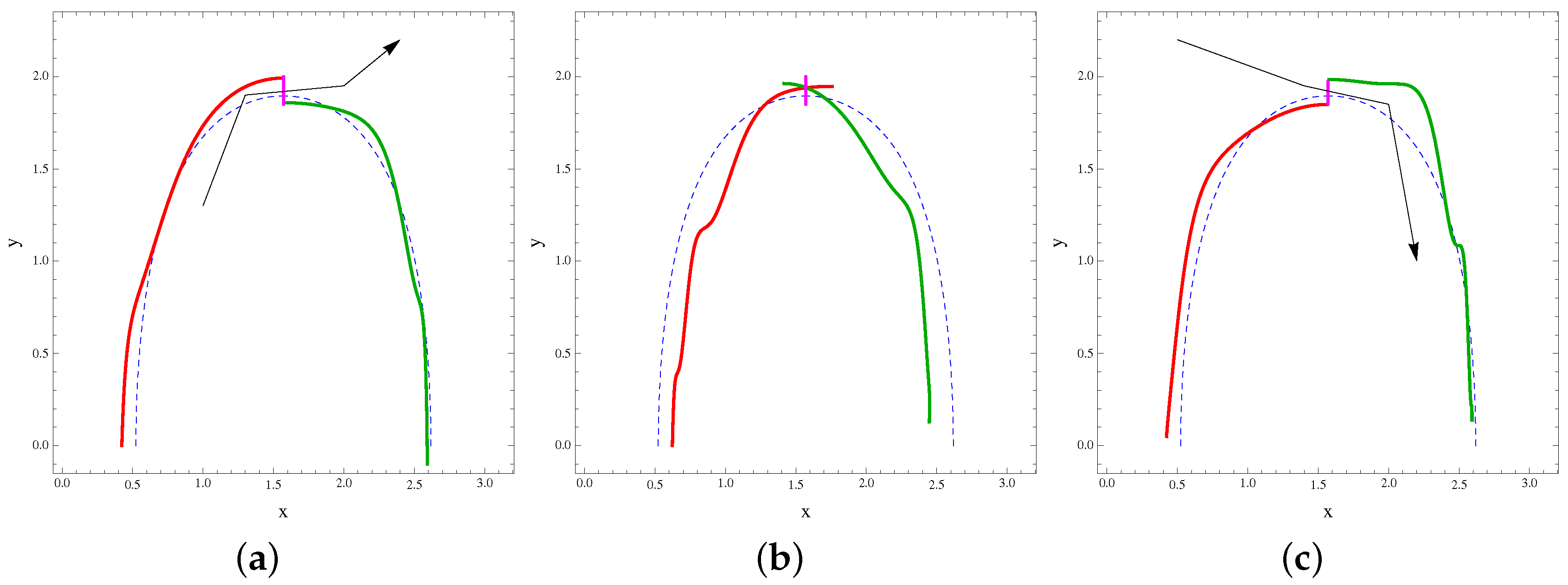 The unstable manifold emanating from when (with no disturbance) points directly northward locally at the hyperbolic trajectory, which in this case is the fixed saddle point . The disturbance would in general give this northward emanation a time-dependent -variation, which is characterized by Theorem 2.2 in [40]. Using this, it turns out (calculations not shown) that the change to this direction is zero. Thus, the unstable manifold, to leading-order in ε, will continue to emanate in the northward direction from the (time-varying) hyperbolic trajectory . Similarly, the stable manifold emanating from will also continue to be in the northward direction locally at .