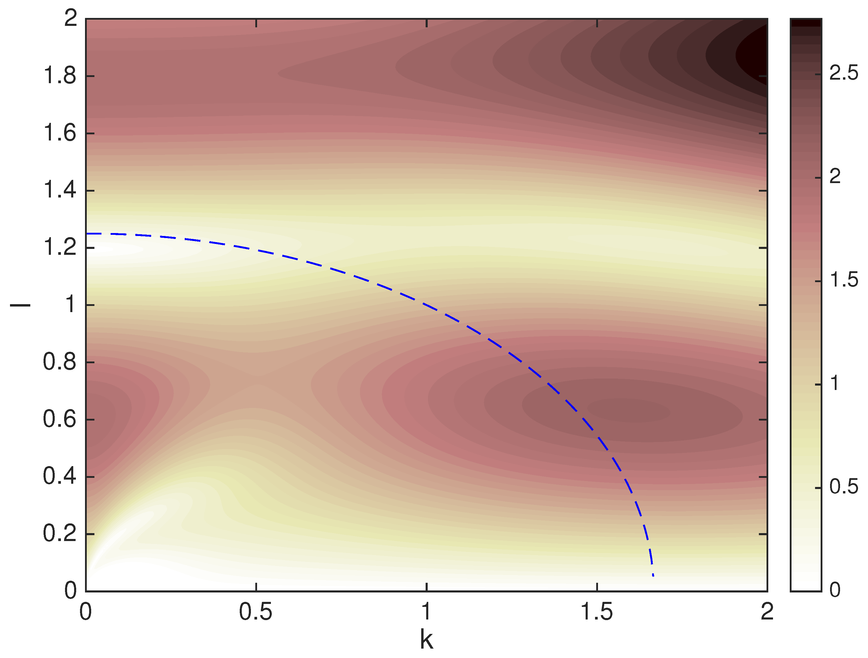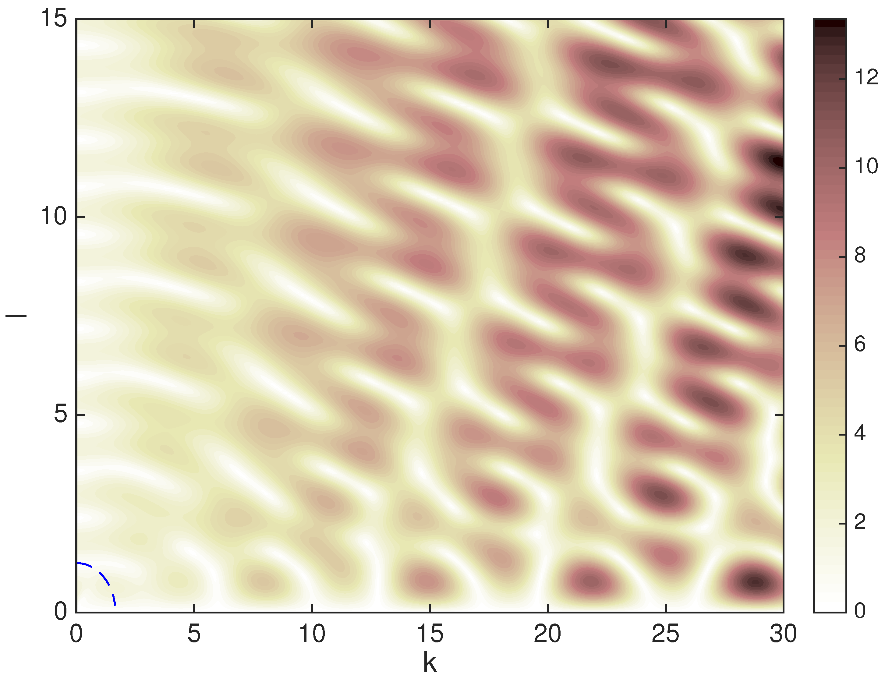 Figure 5 shows the dependence of over a range of wavenumbers for the second Rossby mode. The dashed blue curve corresponds to wavenumbers at which , i.e., when the flux is actually zero. A broad region of -space is examined. There are wavenumber choices that generate very large flux, illustrating a resonance-type phenomena, and others where it is essentially zero. The maximum-flux generating secondary Rossby mode from among the displayed range in Figure 5 occurs at . The distribution is fairly irregular, and could not have been guessed at without having the theoretical methodology that has been developed, which provides an efficient method for perusing the parameter space without having to do complicated Lagrangian advection numerics. Smaller wavenumbers tend to have a small flux amplitude, indicating that disturbances with large spatial extent are not highly influential in causing eddy-jet transport. Since such long waves are known to be prevalent in geophysical flows, more detail of the flux variation associated with them is provided in the zoomed-in Figure 6. As an example, a meandering jet may comprise a range of wavenumbers that are are centred near ; this centre value can be taken as the dominant wave, with the adjacent values as perturbations. Such values would therefore be associated with nondimensional wavenumbers near in Figure 6. While very small for most wavenumbers, the flux amplitude still does exhibit some peaks near and .