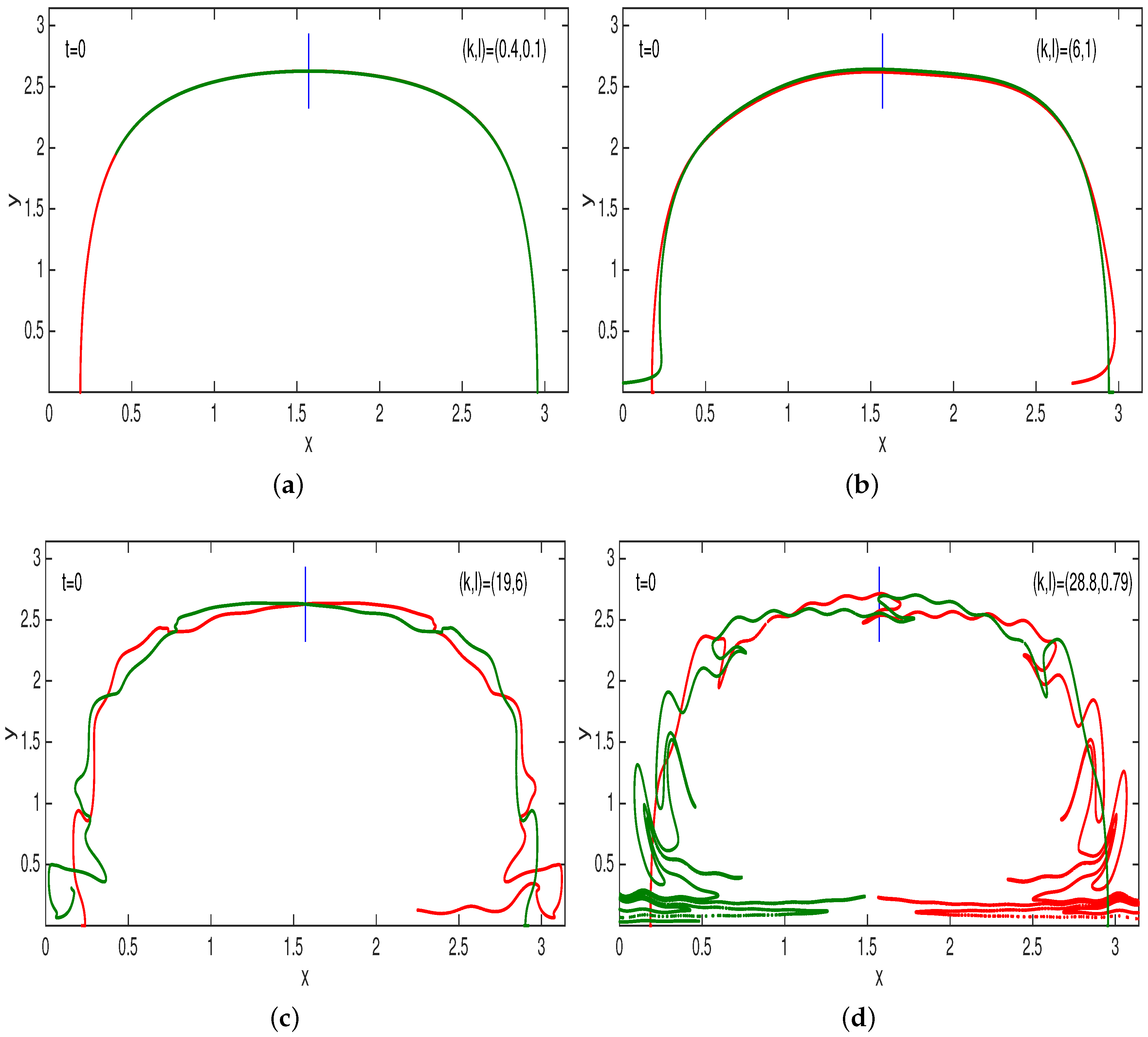 How well do the theoretical flux considerations obtained from Figure 5 match what actually happens? To analyse this, the stable and unstable manifolds for the disturbed system will be used. These are the organizing entities of the chaotic region, and their intersection pattern governs how complicated the mixing is. Figure 7 shows the numerically computed stable and unstable manifolds associated with four different values of the wavenumbers , chosen from Figure 5 and Figure 6 to have tiny, moderate, large and enormous flux amplitudes. Obtaining the manifolds numerically is non-trivial in this case since they are associated with a time-varying anchoring trajectory as opposed to a fixed point, and requires utilizing recent theoretical results [40,41]; a discussion of how these were obtained is given in Appendix C. Figure 7 captures the numerically obtained manifolds only up to a some finite length. All figures are produced by using , a very small perturbation, and the value associated with each pair is given in the captions. In (a), the manifolds fall virtually on top of each other; the interweaving is barely visible. Examining Figure 5, these correspond to wavenumbers in which the amplitude is very close to zero. In (b), there is a mildly discernible difference between the two curves, and in (c), the lobe structure as anticipated by classical results [49,51] and sketched in Figure 2a—but more irregular—is visible. Notice that the expectations of the lobes’ stretching and folding are in fact realized, and so chaotic transport will occur. Even for small ε, there is considerable mixing between the eddy and the jet. This lobe structure is also present in (a) and (b), but the deviations are too small to notice well.