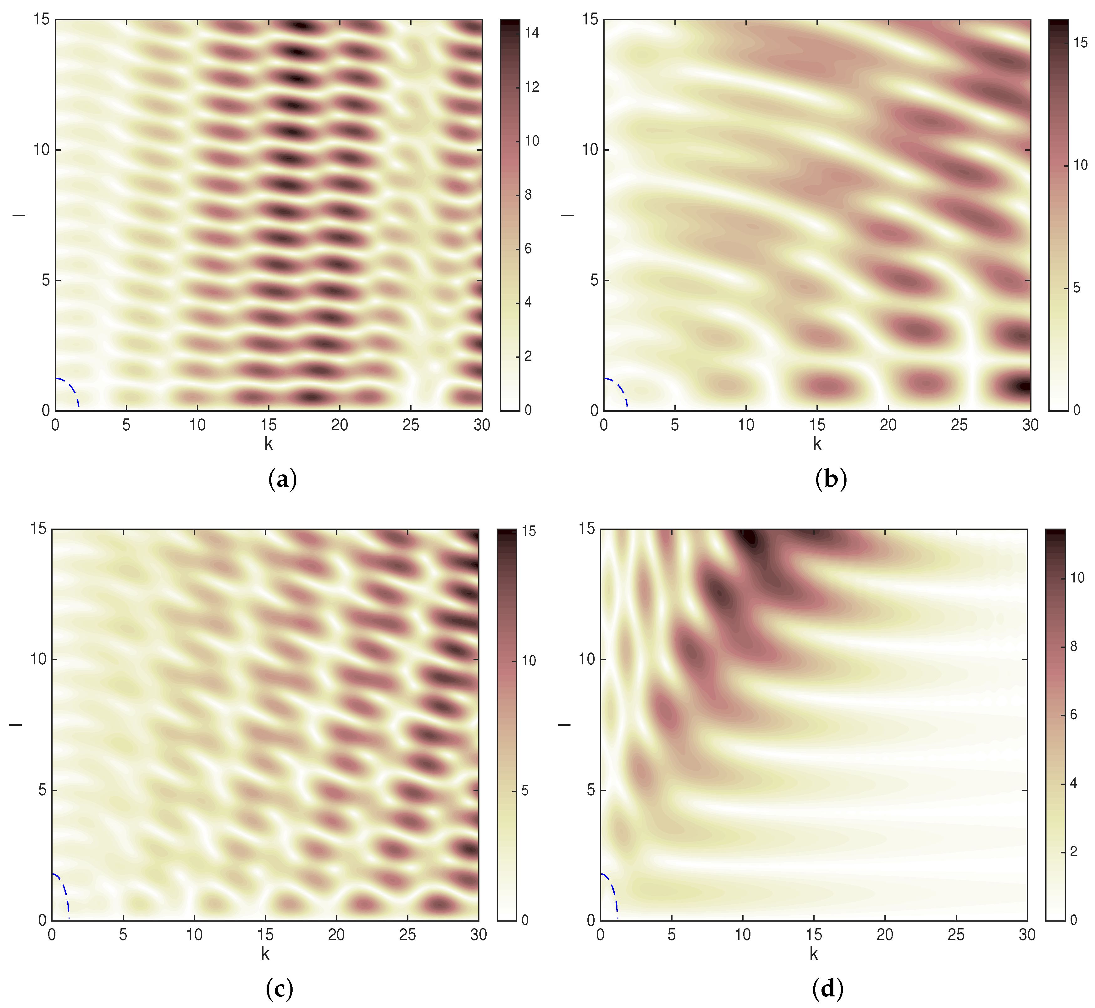 There may be restrictions on the wavenumbers in the perturbing stream function (10) or (12) depending on the problem at hand. In an “open ocean/atmosphere” model there may be no restrictions. If the eastward spatial periodicity is to be preserved (for comparison with a numerical solution of the PV Equation (2) generated using periodic boundary conditions, say), then should be restricted to integer multiples of . As another example, in a channel-flow model with vertical boundaries and , and all possible s would be restricted to taking values that are integer multiples of . In this article, a particular restriction shall not be imposed; the methodology presented for finding flux and flux-optimizing wavenumbers can easily be restricted to any such case if needed. In either of the forms (10) or (12), the -dependence will not in general be periodic or quasi-periodic. Moreover, the possibility of dealing with wave packets such as these is a first step to determining the flux occurring due to stochastic perturbations, for example by choosing the εs from an appropriate random distribution.
