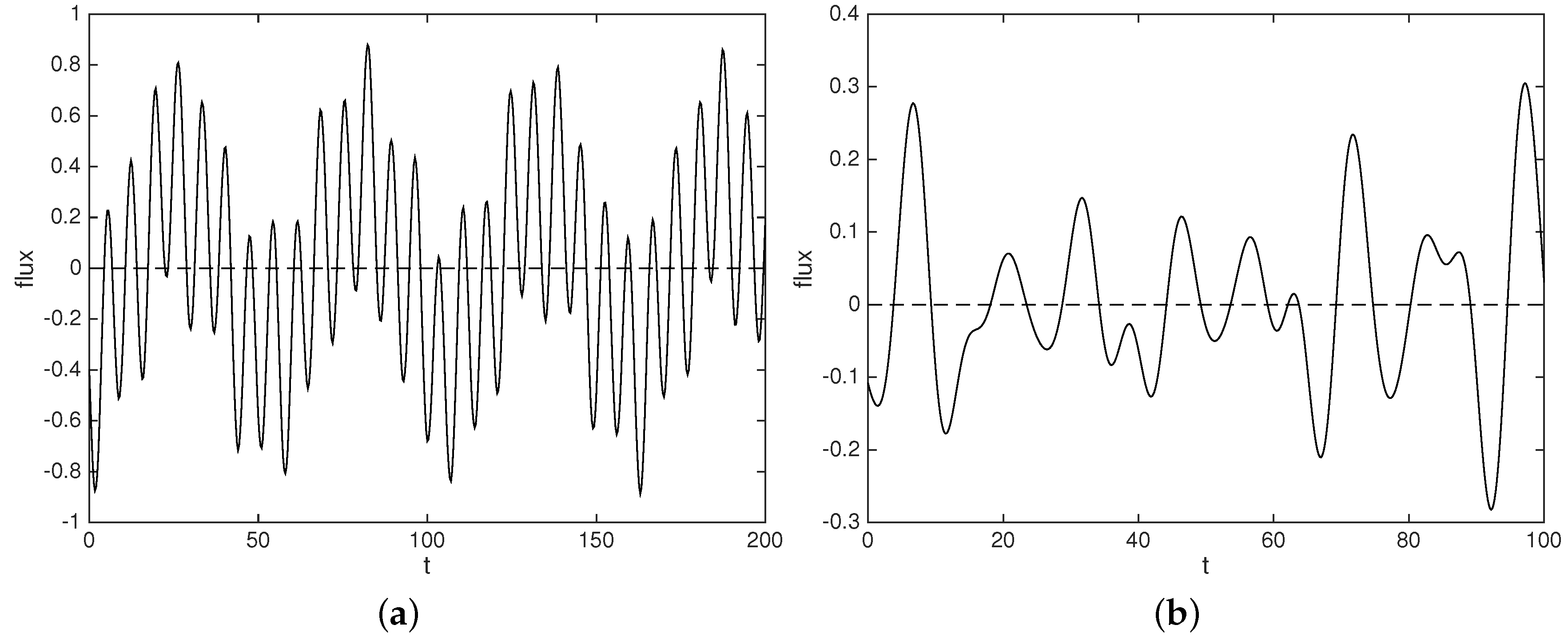 Most transport studies that work with the Lagrangian trajectories focus on fluid flux. However, understanding scalar fluxes of many other quantities—such as heat, pollutant, energy, plankton, nutrients and potential vorticity [23,56,63,64,65,66,67]—is often of interest. One contribution of the present article is to provide a method for quantifying both the fluid and tracer flux between an eddy and the jet as a time-varying entity, without having the need to identify lobes, or even for lobes to exist. This enables the determination of fluid/tracer flux for disturbances that are not time-periodic, for example consisting of wave packets with zonal and meridional wavenumbers distributed either discretely or continuously [68]. The computability of the flux in such situations is presented in Section 3.3. This new tool is anticipated to have applicability in other situations, for example in determining the future depletion of an eddy subject to wave packets with wavenumbers normally distributed around known stable values.