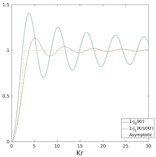 Expression (14) is similar to Equation (3.1) of [9], except that the latter relates instead to the full structure function. What differs is the factor in parentheses (the full expression has ). The two expressions behave similarly, however, acting as high pass filters (Figure 1). For small arguments (), the filter is proportional to (see below), while for large arguments, it approaches one. Hence, asymptotes to twice the total kinetic energy at large separations.