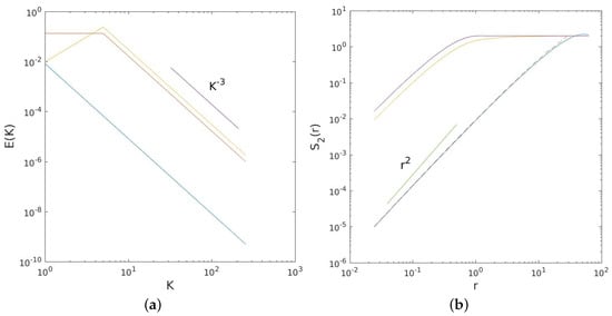 - Kraichnan, R.H. Inertial ranges in two-dimensional turbulence. Phys. Fluids 1967, 10, 1417–1423. [Google Scholar] [CrossRef]
