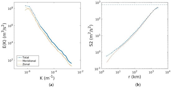 The zonal, meridional and total energy spectra extracted from Figure 3 of [18] ((a) panel). The 2D longitudinal structure function calculated from the zonal energy spectrum is shown by the solid curve in the (b) panel. Also shown is the structure function (dotted curve) calculated from data, obtained from Figure 3 of [26]. The dashed horizontal line is the twice the zonal energy, calculated from integrating the zonal spectrum. Reproduced with permission.