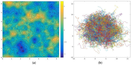 Streamfunction (a) and particle trajectories (b) from a two-dimensional turbulence simulation forced in the range . The trajectories have been “unwrapped” from the doubly periodic domain, which explains why their extent exceeds the domain scale of .