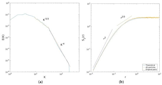 Kinetic energy spectrum ((a) panel) from the turbulence simulation, reproduced from Figure 9 of [17]. The structure functions ((b) panel) calculated from the energy spectrum (solid curve), from all particle pairs (dashed red) and from pairs deployed together (dashed yellow).