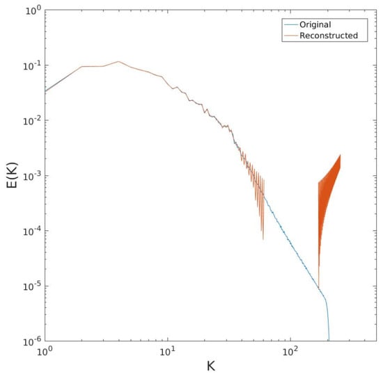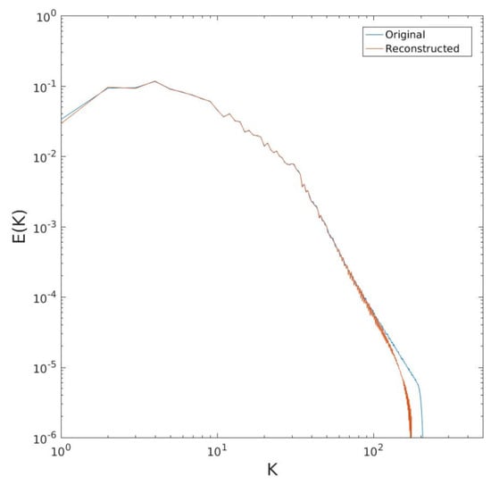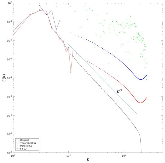 To test the transform (15), we first use the structure function calculated from the energy spectrum. We do this numerically. (Cree and Bones [36] discuss the numerical evaluation of Hankel transforms. In such cases, the transform integral is (necessarily) truncated at a finite upper limit. To accommodate this, the transformed function is assumed to vanish above this scale/wavenumber. Appropriate choices of equally-spaced separations and wavenumbers are also made. We employ Hankel functions which are available in Matlab (www.mathworks.com)). Of course, this is just a test of the invertibility of the Hankel transforms linking the two measures. The result is shown in Figure 6. The reconstruction is good in the wavenumber range below the forcing range, but at higher wavenumbers, the predicted spectrum deviates from the original substantially, even becoming (nonphysically) negative at some wavenumbers.