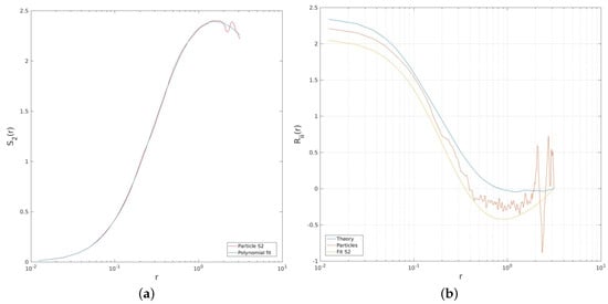 Second-order structure function for the particles with a sixth-order polynomial fit ((a) panel). The two-point velocity correlations calculated using (8) and (13), for the raw particle data (red), from the polynomial fit of (yellow) and derived from the theoretical structure function ((b) panel).
