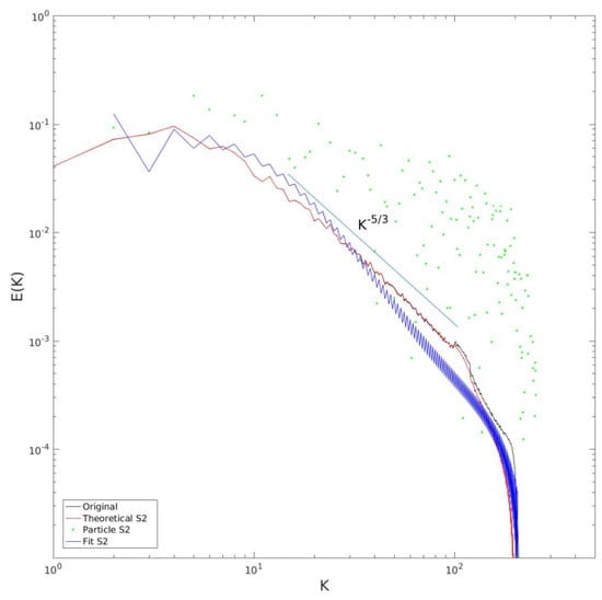 Spectral reconstructions from a simulation of a 2D inverse cascade, forced in the range . The original spectrum is in black and the reconstruction from the theoretical structure function is in red. The green dots show the spectrum from the raw particle and the blue curve shows that obtained with the polynomial fit .