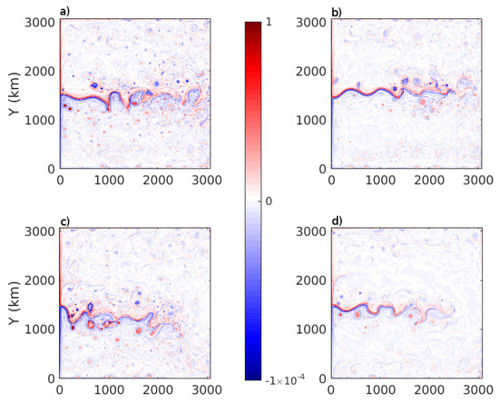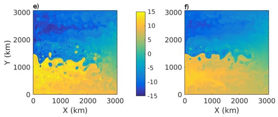 Note the difference in notation with Equation (2) from Hogg et al. [13]: they used the atmosphere-ocean temperature difference where we use the SST perturbation. Local SST perturbations affect wind stress, so, to avoid having the gyre-scale SST pattern influence the wind stress, we spatially high-pass filter the QG SST perturbation. Small et al. [4] (and references therein) point out that the relationship between SST and wind stress that is of interest here occurs on ocean mesoscales, and is in fact opposite to the relationship at basin scales; our use of a high-pass filter ensures that only the eddy-scale part of SST contributes to the wind stress dependence. Furthermore, the SST itself, not the difference between SST and atmospheric boundary–layer temperature, is the quantity found to influence wind stress in observational studies ([4,5] and references therein). The Hogg et al. [13] formulation has the benefit of allowing the atmospheric boundary-layer conditions to adjust to the SST; this effect is lacking in our model, where the atmospheric velocity is imposed, symmetric, and purely zonal.
