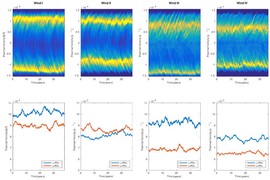Temporal evolution of the distribution of surface pseudo PV () from the simulations with different wind stress formulations I–IV. The northern 20% and southern 20% of the domain have been excluded from these statistics in order to highlight the asymmetry concentrated around the inter-gyre jet. Temporal evolution of the distribution of potential vorticity (up) and of the mean positive and (minus) mean negative potential vorticity (down).